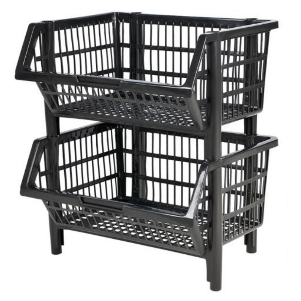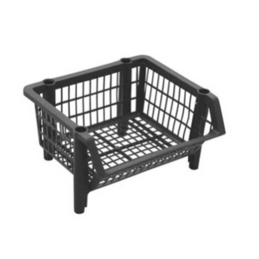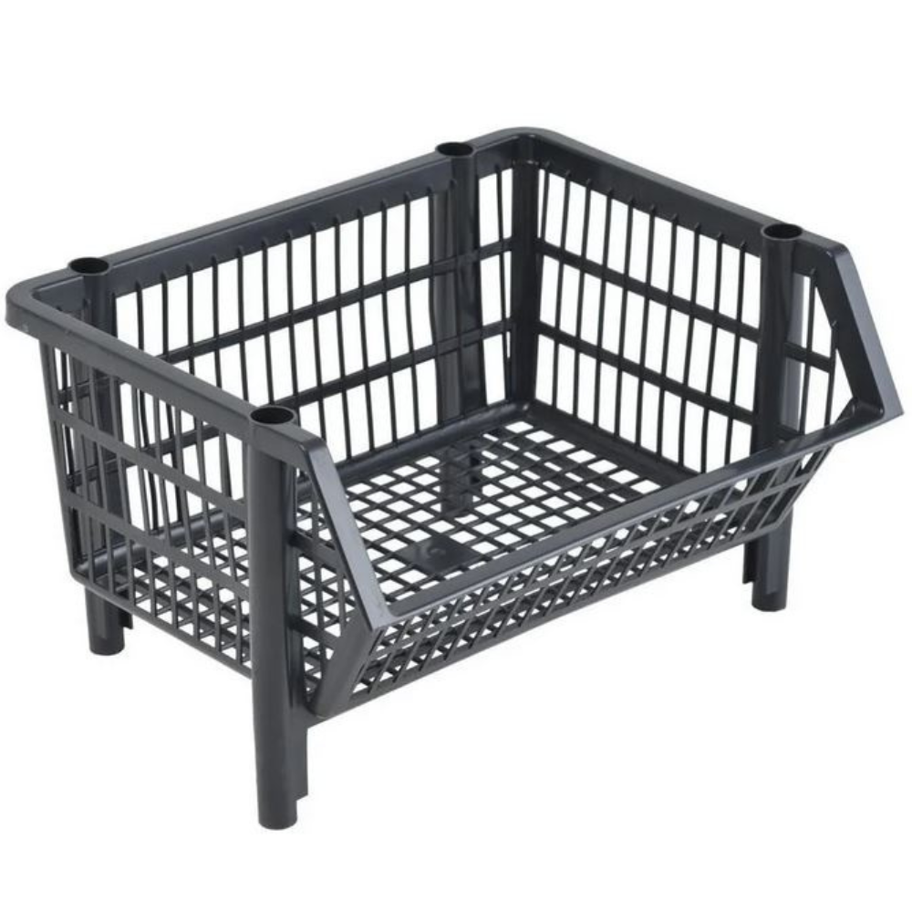 Cesto expositor pequeno, empilhável e vazado, ideal para organizar e expor produtos no comércio.