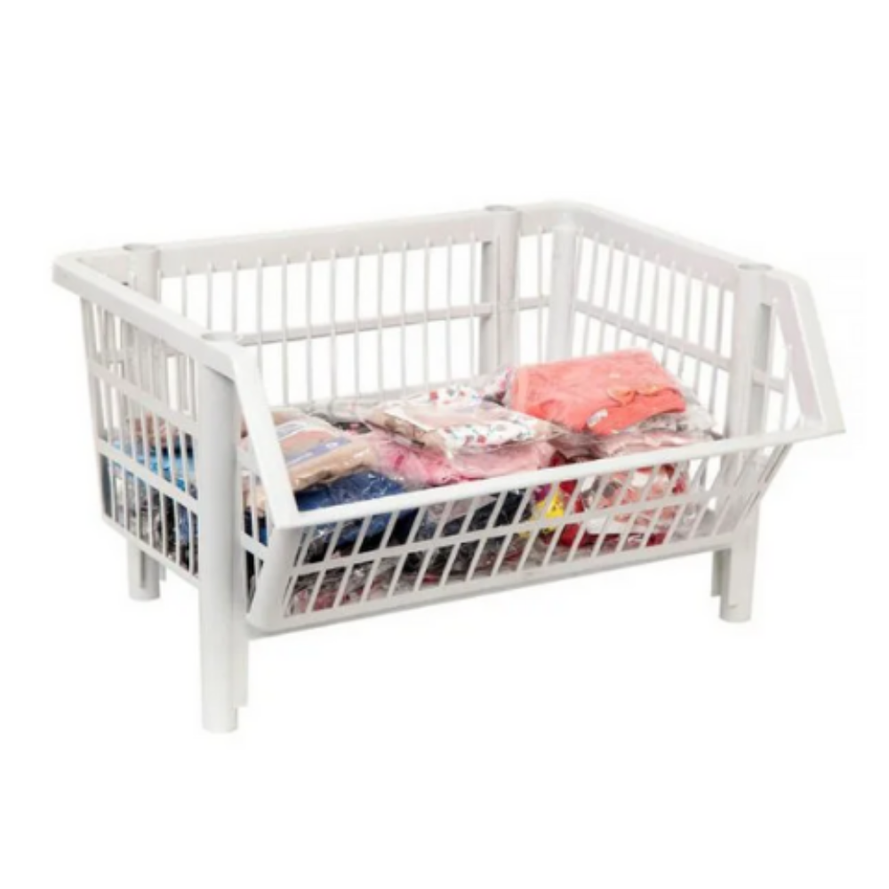 O Cesto Expositor Pequeno é ideal para armazenamento e exposição de produtos como roupas, calçados, alimentos, acessórios e outros itens comerciais. Leve, prático e econômico, otimiza o espaço da loja e do estoque. Totalmente vazado e empilhável, pode ser encaixado em formato de estante com até oito peças, oferecendo versatilidade e organização.